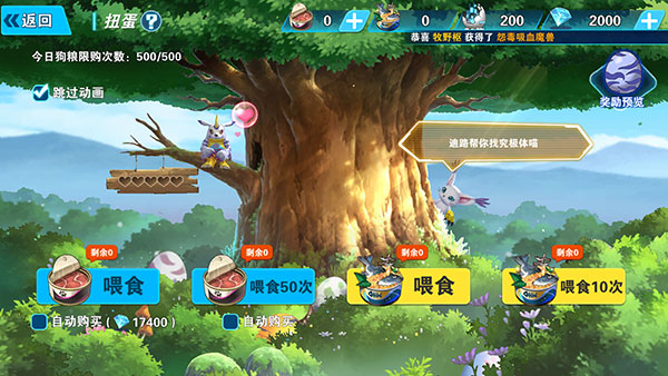 喂食狗粮/高级狗粮,提高数码宝贝的好感度,从而获得开启扭蛋的机会。