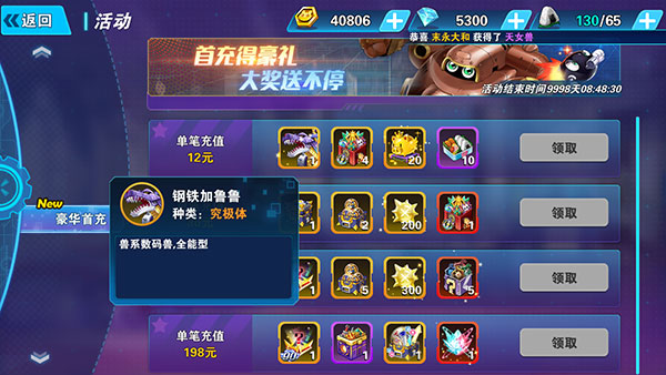 游戏内的各种活动都会产出新的数码兽,完成活动目标即可领取。