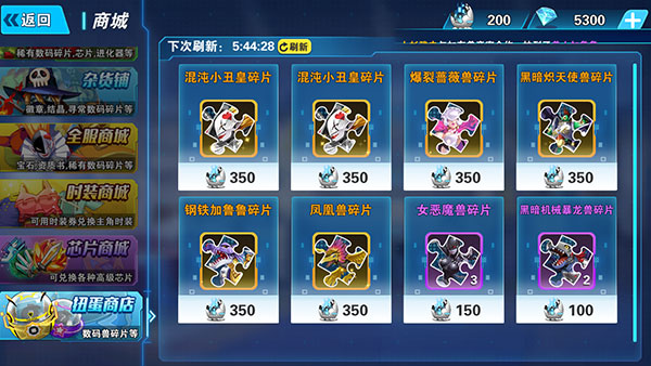 每隔一段时间,商城中都会随机刷新出一批数码兽/数码兽碎片,玩家可以直接购买。