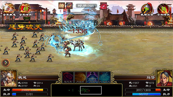 技能分军师技、武将技,其中军师技指被玩家选为军师的名将会自动对敌我两军的整体属性产生影响,而武将技是名将对敌战斗的必杀技,武将技很大程序上左右战局胜败,由于释放技能会消耗技力并需要一小点冷却时间,所以玩家要采取一些技能释放的策略。