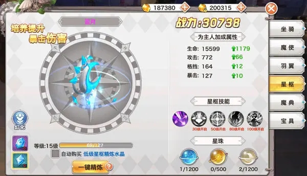 玩家达到50级即可开启星枢功能,点击培养专属星枢,主要提升暴击伤害。