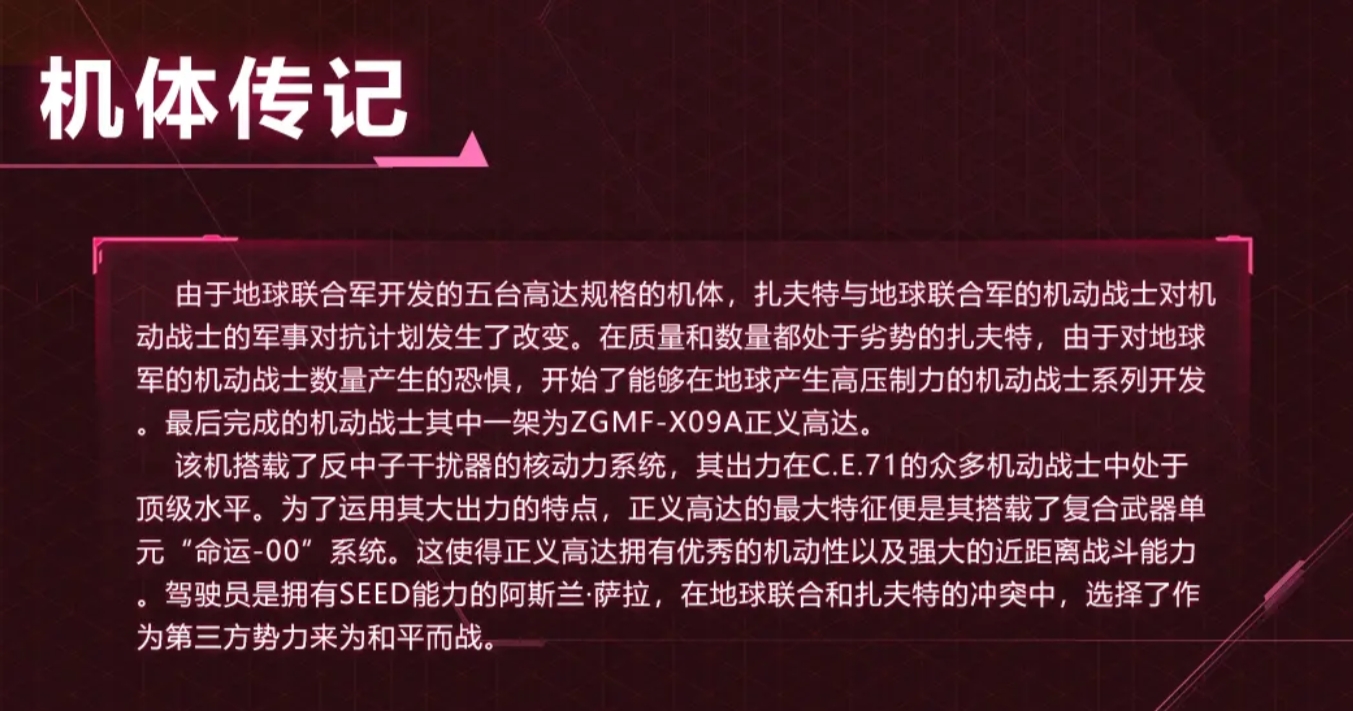 在战斗中,正义高达能够分析敌方的攻击动作并做出反应,在受到护甲低于自己的目标攻击时,提高自己1%技能伤害,1%攻击力,最多叠加10层。