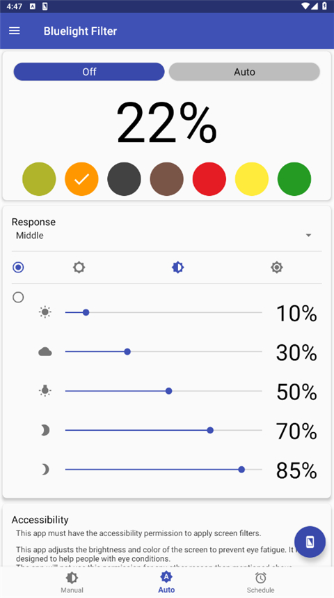 这款软件可以非常方便的调节屏幕的颜色,开启颜色调节功能,可以非常有效果的减少光效的影响,并且支持自动了解屏幕亮度,还可以支持自定义开启过滤,非常棒的一款保护眼睛的软件。