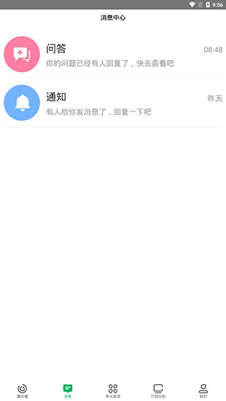 2、切换到【消息】页面,我们我们就能在此查看问答、通知、对话等方面的信息。