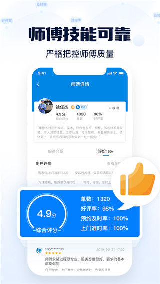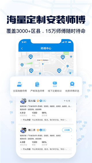 3、地域覆盖广;全国20万优秀师傅,覆盖3000+区县,好师傅轻松找。