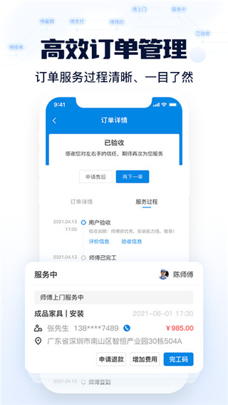 APP的功能挺多,比如可以发布订单找师傅,支持定制柜子、门窗等多种服务类型。用户还能管理订单,关注报价和师傅安排的情况,关键节点还会通过短信或微信通知,这样就不用总是担心订单状态了。另外,平台还提供担保和保险,保障下单方的权益,售后服务也无忧。