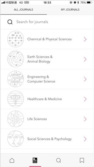 Researcher app是一款专业的学术期刊、文献的阅读软件,由许多科研工作者合力打造,完全免费,对于经常需要查找论文、各类文献和参考资料的用户朋友,这将会是你最好的帮手。app涵盖了10多个学术领域超17000种期刊,比如医学与健康科学、生命科学与生物学、化学与材料科学、工程与计算机科学等等,用户可以自由选择想要了解的文献进行阅读。除此之外,为了方便用户进行查找,Researcher安卓版全新升级了搜索功能,通过新加入的关键字搜索和或文字过滤器,让用户可以轻松找到自己想要阅读的期刊。