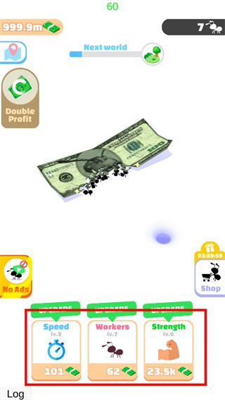 2、随着蚂蚁对食物的拆解搬运,收益逐渐提升,你可以提升蚂蚁的基础属性,让蚂蚁可以更加快速的进行拆解搬运,获取到更多的收益回馈;