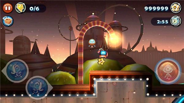 3、这个游戏的操作是屏幕虚拟按键,这样可以完成前进,后退,跳跃,还有隐藏的抓取按钮。可爱的造型机器人科迪,在游戏中需要找到能量,找到齿轮,这样才可以高分过关。