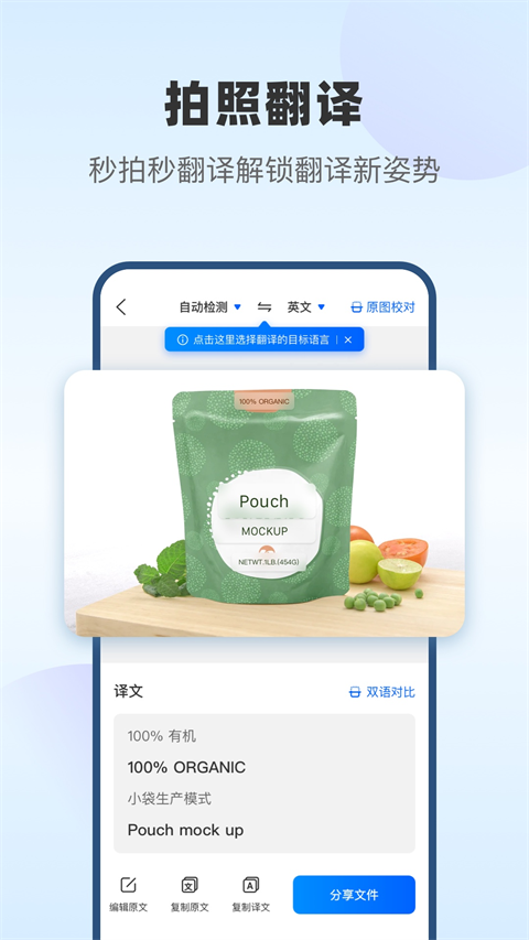 - 拍照翻译:用户可通过拍摄图片或上传图片的方式获取需要翻译的文本,并将其转换为目标语言。