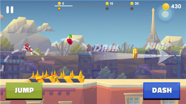 3、途中有着多种障碍,点击“JUMP”可控制人物跳跃并收集途中樱桃资源