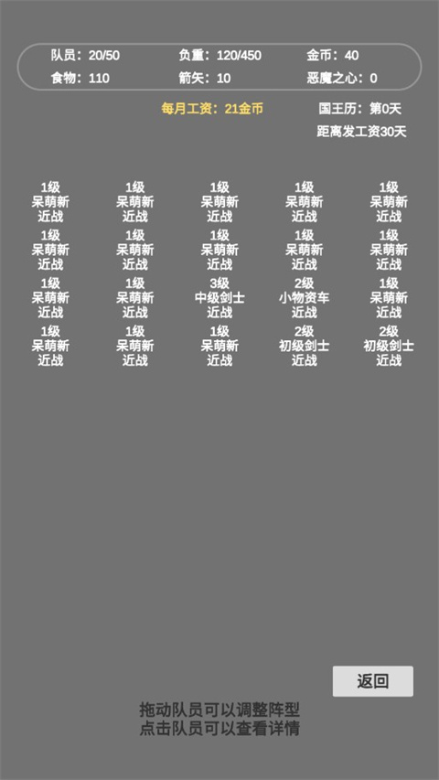 文字恶魔城中玩家开局就会成为国王,你需要招募士兵,打造豪华队伍阵容出征狩猎,狩猎获取的多余食物可以前往市场进行交易出售,赚取金币购买自己所需的各种道具与食物,快去招募你的伙伴出发吧,出发前记得带足粮食和其他消耗品。喜欢的玩家不妨下载体验一下试试看吧!