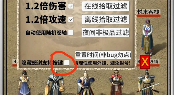 离线挂机过滤:每天20:00–24:00直接离线挂机,第二天早上5:00–20:00直接上线,离线过滤才生效, 在极品过滤表里,勾选什么装备,就捡取什么装备的极品装备。