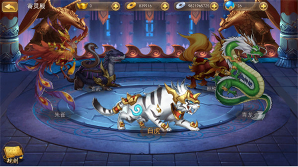 寄灵殿乃神兽所在之宫殿,神兽守护着古神留下来的寄灵。一共有麒麟,青龙,白虎,朱雀,玄武5只神兽,每只神兽守护的寄灵种类不同,主公需要消耗灵力值来挑战神兽,获取寄灵