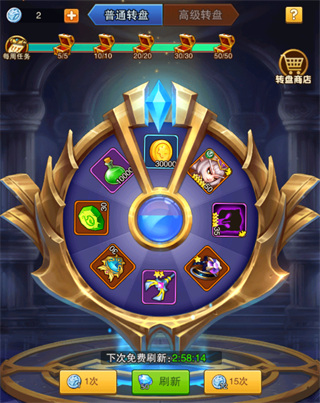 B、在普通转盘每次进行抽取将获得10转盘积分,可以在转盘商店使用转盘积分换取高星英雄、装备等。