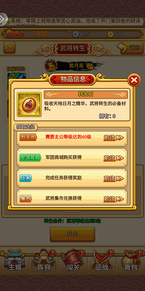 4、转生石不足的话,可以通过群英塔、军团商城、任务、集市等途径获取。