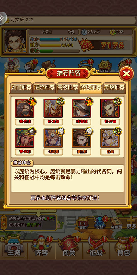 以神庞统为核心,神庞统就是暴力输出的代名词,闯关和征战中均是每击致命。