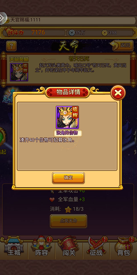 首次点亮某一天命时,即可领取武将或者武将信物,凑齐足够数量的信物即可招募对应武将。