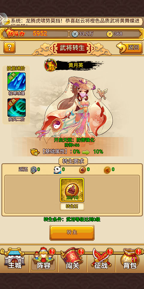 3、转生成功后,不仅会提升该武将的基础属性,而且还会开启新的天赋。