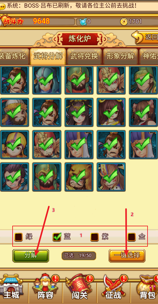 勾选好想要分解的品质,一键选择,点击分解就会将武将分解成用于升级的将魂