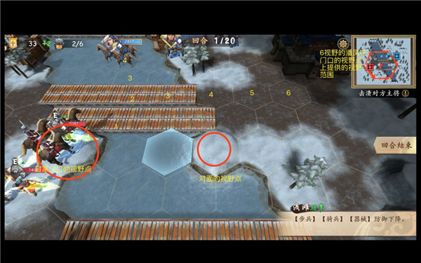 地图越小,视野越容易控制,如图所示,我使用的视野武将是潘凤,本身视野为3,装备为鹰+绝影,视野再+3,总视野为6,在两个基地的门口、木桥的旁边,都有一个1级高台,为本图先手的最佳视野点,后手需小心些,因为距离短,跑上去的视野兵可能第二回合就被集火死了。