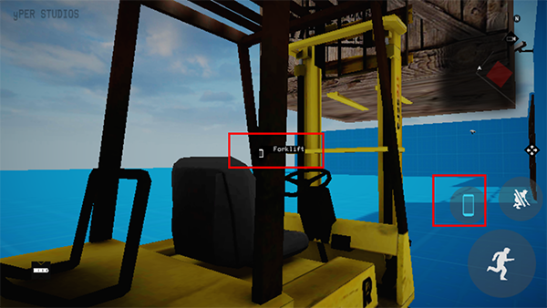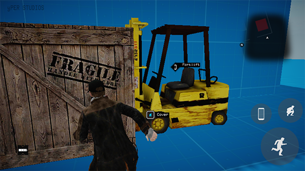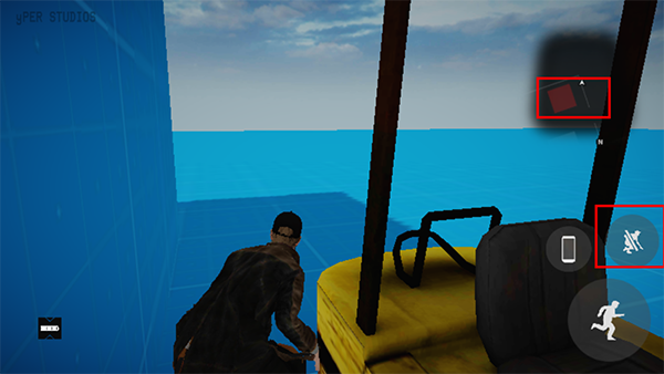 2、进入游戏可以看到右下角的操作选项,手机操控,切换蹲走/跑步,右上角是视角,红色部分为警戒区域