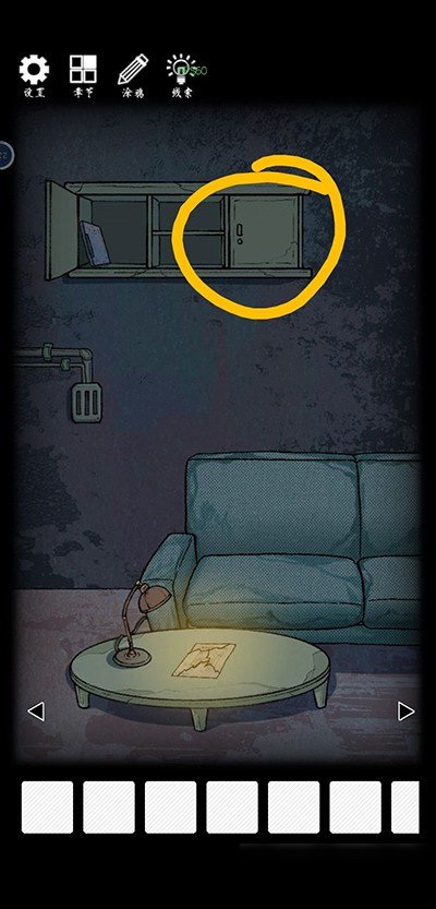- 提升沙发坐垫,找到残缺的平面图。使用钥匙c开启左侧柜子,获取线索。