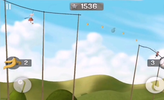 游戏的页面非常简洁,左边的拐杖按键是用来钩挂缆绳或者凸起物,在游戏中后期难度提升时会加入这个元素。