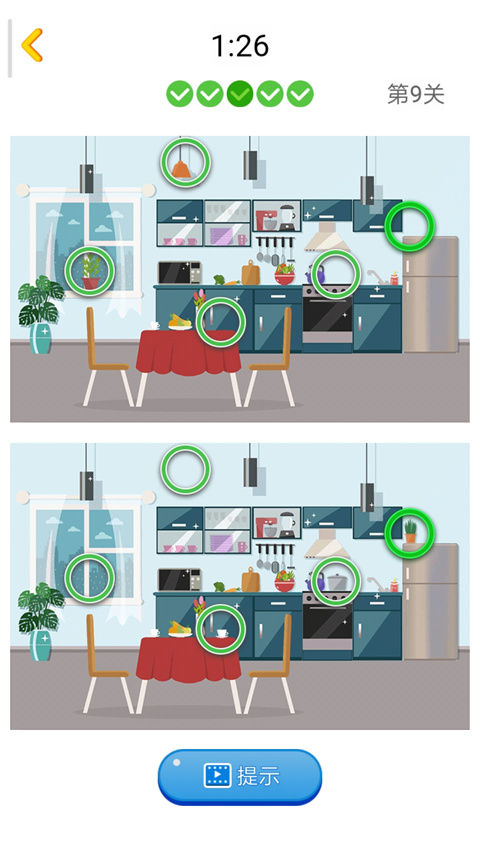 第9关答案:墙上橙色的灯、窗户上的盆栽、冰箱上的盆栽、桌子上的杯子、油烟机下的锅;