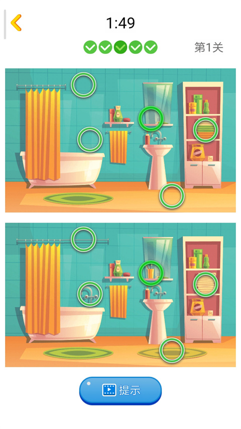 找茬游戏在很早之前就一直受到玩家们的喜爱,比如“找你妹”相信这款经典游戏不少玩家并不陌生,自12年起在这个手机游戏群雄逐鹿的年代,可见其热度,而今小编为大家带来的是有着和找你妹一样玩法的游戏,就是这款全民找茬游戏,该游戏对比找你妹而言有着简约清新的画风设计,玩法也是很简单,玩家只需要在两张相同图片上找到不同点,比如第一关卡,需要找出杆子、水龙头、杯具、地毯、毛巾,全部找出就能完成通关,所以非常考验玩家的发现能力,还有反应能力。同时游戏是会限时的,玩家需要在两分钟之内找出5处不同的地方,否则就会游戏失败,需要重新来过。除此之外,全民找茬游戏不仅拥有着众多精心设计的关卡供玩家们挑战,还有着多张精美的的图片,精致的插画风格,玩法轻松休闲解压,喜欢的玩家不妨下载体验一下试试看吧!