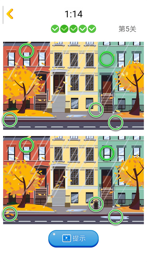 第5关答案:二楼右边窗户、左边窗户顶、地上的树叶、右边楼房前的水与物体;