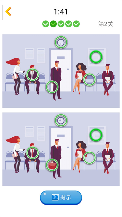 第2关答案:时钟、公文包、椅子、男人的领带、墙上的表;