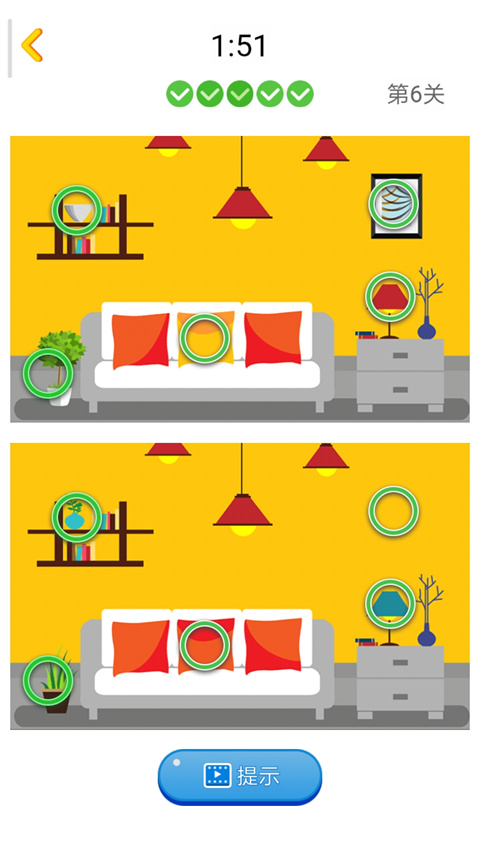 第6关答案:墙上的装饰物和白色的碗、枕头、地上的盆栽、柜子上台灯的颜色;