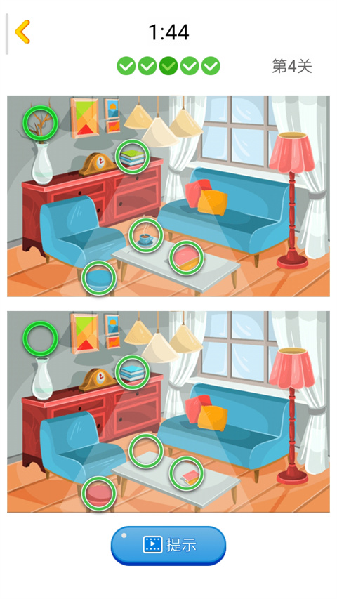 第4关答案:凳子、咖啡、桌上书本与柜子上的书、瓶子里的装饰物;