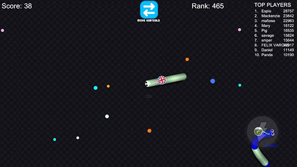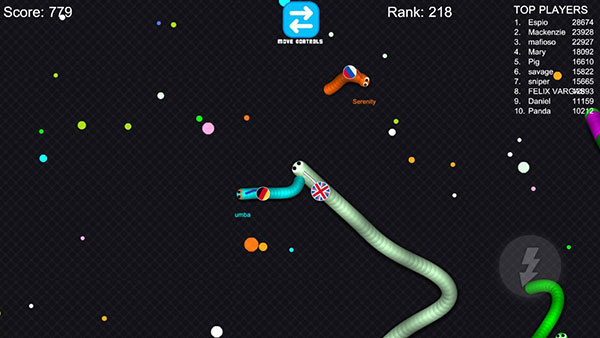 游戏采用了摇杆控制走位的操作方式,这倒是让小编无奈了一把,最开始小编还以为是滑屏控制或者按住蛇头来控制,结果是摇杆。游戏中摇杆虽然是自由模式的,玩家们并不需要固定在某一个地方进行控制,但是摇杆的大小简直太小了,在操作的时候方向很难准确的控制,不仅如此,蛇蛇在转向的时候还有大约一秒钟的延时效果,所以控制起来很累,每一次转向都要等待蛇头延迟以后才能确定新的方向,这一点操作上的败笔可以说瞬间让人感觉没有信心了。