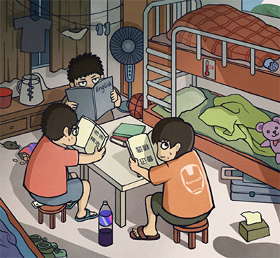 2、穿蓝色衣服的男生,书本里夹着一本漫画书,点击漫画书就可以了。