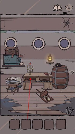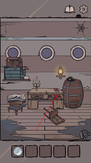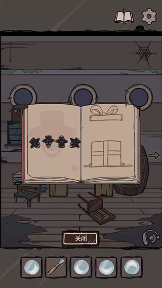 9、画像旁边墙壁上有个一号角的涂鸦,将它贴到本子上的问号处,按照行李箱、船票、船、号角的顺序进行点击,翻页到礼物盒,点击礼物盒可发现最后一枚月亮便士。