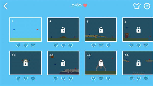 5、玩家需要通过画线来让蓝先生和红小姐相遇,另外游戏通过玩家画线的多少来决定获得爱心的多少;