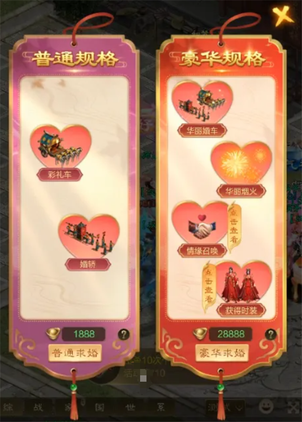 普通求婚:1888金,可进行婚礼流程,护送的婚车为普通婚车。