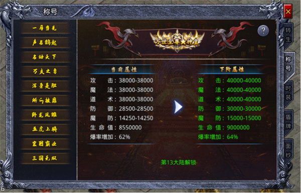3、转生可增加角色攻击、魔法、道术、防御、魔防、生命值等基础属性