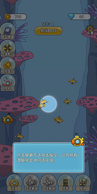 1、点击屏幕下达攻击指令,己方所有潜艇就会冲向该区域。