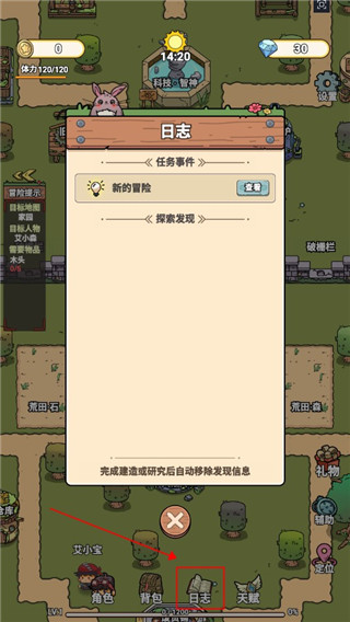 2、多看日志,日志在屏幕底部,天赋按钮的旁边。日志里面有详细介绍怎么玩,还有任务提示。