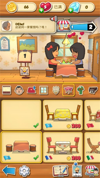3、在游戏中玩家们要注意获得更多的得分是需要我们使用最少的移动步骤来通关的,这样我们每次就可以顺利地获得非常多的加成,玩家们还要注意,我们餐厅的等级也会影响到加成的。