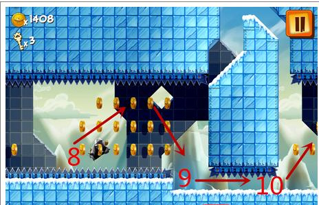 8.最后一步,在10号位置用手指迅速在屏幕上往上滑,让企鹅跳到上面的平台,恭喜你终于过关了!