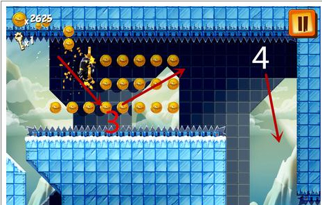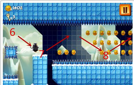 4.在4号位置的时候要马上用手指在屏幕上往下滑,让企鹅快速下降并且一直按住,让企鹅趴着滑过去。