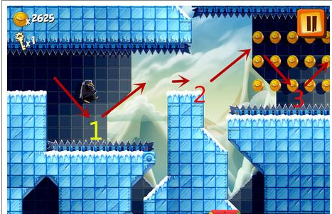 1.在企鹅下落到1的位置时,手指在屏幕上往上滑,让企鹅跳到小平台上。2.在未走出平台的时候(2号位置),就要手指在屏幕往上滑让企鹅跳起来。