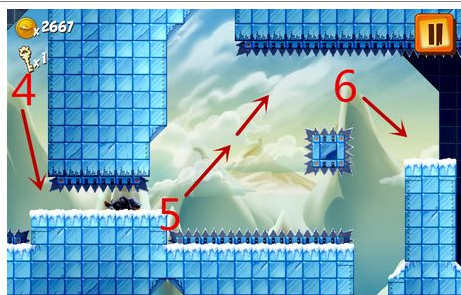 6.在6号小平台要准备好三连跳,三连跳其实也不难,7号位置快速起跳,落到8号位置的时候再次用手指在屏幕上往上滑动再跳。