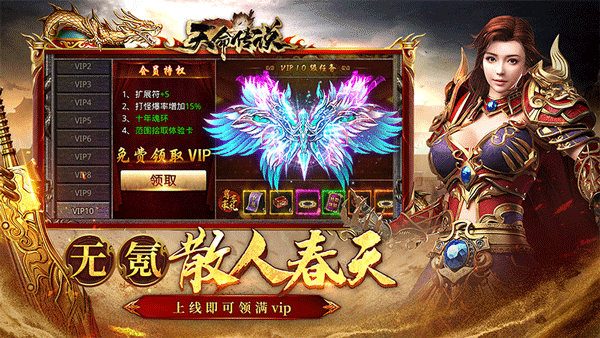 无需氪金,无需任务,登录即送VIP10!畅快体验直接拉满。顺利度过新手期,打怪升级总是快人一步!
