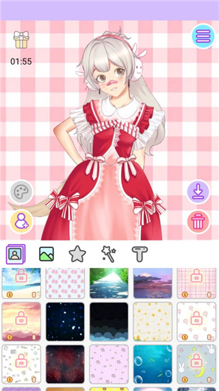 2、操作画面暖心、简洁,可拖动,可删除,可调色,可全屏,还可一键初始化,简单快捷的进行化妆和装扮