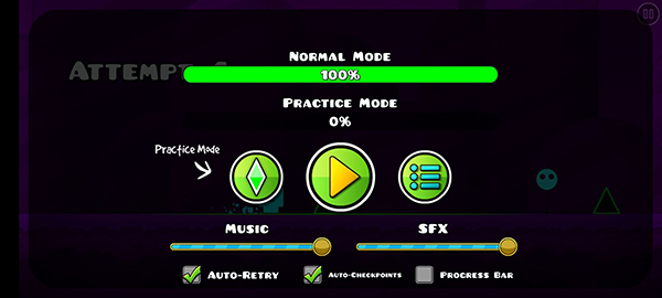 几何冲刺为单键操控,只用一个按键就能完成对所有模式的操控。点击或长按空格键/鼠标点击/方向键的”上“键均可视为一次操作(对应手机端的点击或长摁屏幕)。手柄玩家对应的键位则是摁下摇杆。